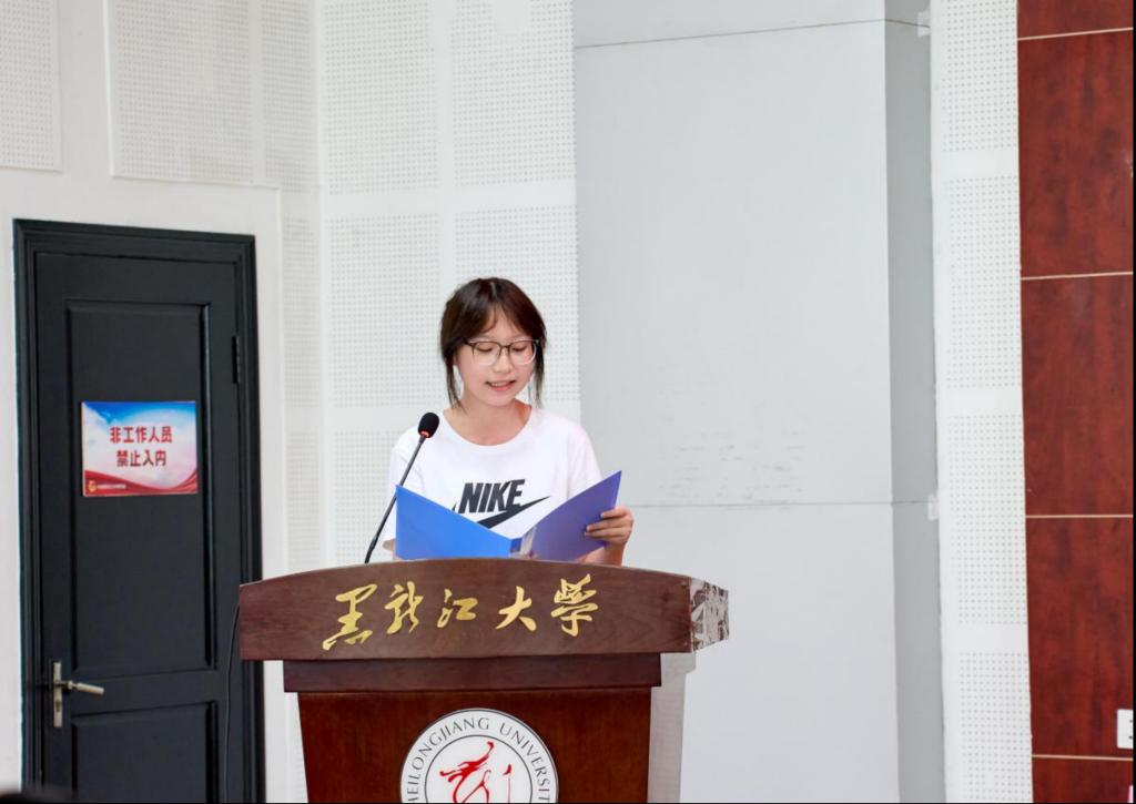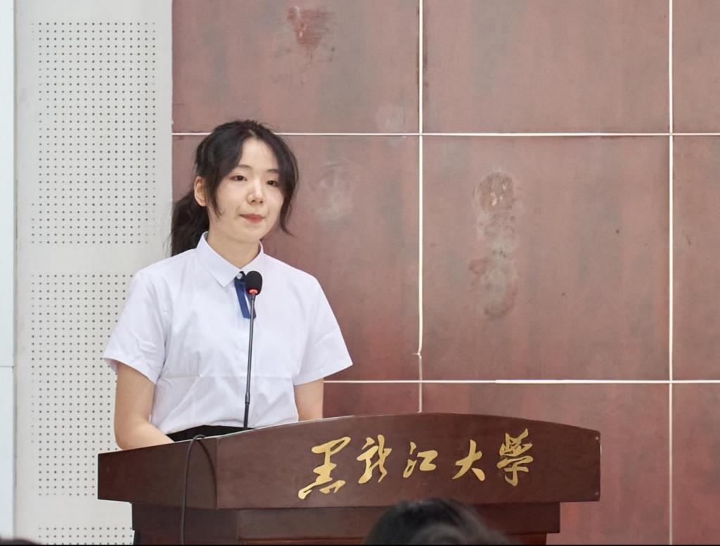 哲学学院2025级应用伦理专业王艺媛同学代表研究生新生发言,她在发言中首先表达了踏入学术新阶段的欣喜与敬畏之情,并对家人的支持与学院的培养致以衷心感谢。她表示研究生不仅是知识的学习者,更应成为思想的探索者、价值的判断者和未来的建设者。她代表全体新生表示,将以马克思主义为指导,提升理论素养与思辨能力;未来会不负师恩与亲情,在黑大深耕“爱智慧”领域,以实干书写青春,为学院添彩。