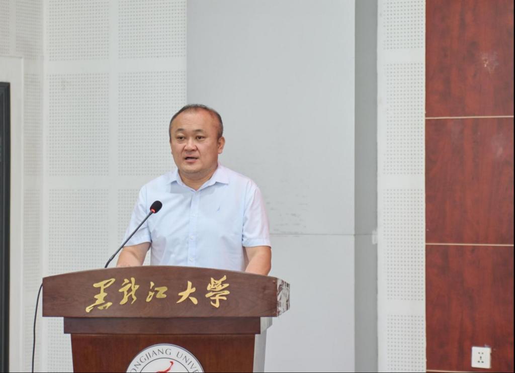 哲学学院院长蒋红雨教授致辞,他简要介绍了黑龙江大学哲学专业的显著优势与特色,表示学院历史积淀深厚,拥有优良教研传统;学科层次高、学科平台在国内学术界具有重要影响力;研究方向鲜明、学者云集;培养体系完整,覆盖本硕博到博士后的全链条人才培养体系;紧跟创新,参与“101计划”等教育改革。同时,他希望同学们在开启哲学学习之际,做好以下四点准备:第一,怀有荣誉感与专业信念;第二,训练洞察本质的能力;第三,秉持坚韧的求学态度;第四,树立家国社会责任感。此外,蒋院长也提出两项要求:第一,自觉系统学习以强化创新;第二,尽早规划确立职业发展方向。最后,蒋院长希望新生们能够珍惜时光,潜心学问,在哲学的世界里探索真理,成就更好的自己。