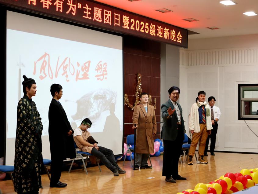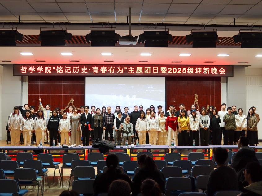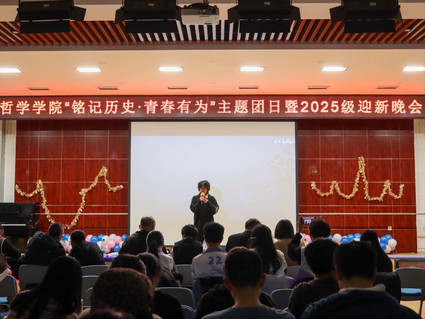 哲学学院于2025年11月19日晚在大学生活动中心三楼报告厅开展“铭记历史·青春有为”主题团日暨2025级迎新晚会。哲学学院党委书记孙美晖、院长蒋红雨、党委副书记王贵宇、副院长周来顺、副院长周晓莹、正处级辅导员孙庆斌、辅导员焦瑞、辅导员赵慧雪、2025级新生及各年级学生代表出席晚会。