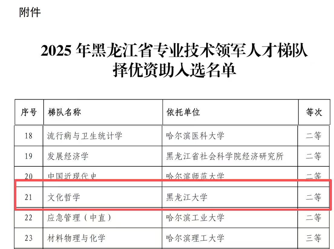 近日,黑龙江省人力资源和社会保障厅公布了黑龙江省专业技术领军人才梯队择优资助名单。黑龙江大学哲学学院“文化哲学”人才梯队成功入选,彰显了我校在该学科领域的专业实力与人才优势。