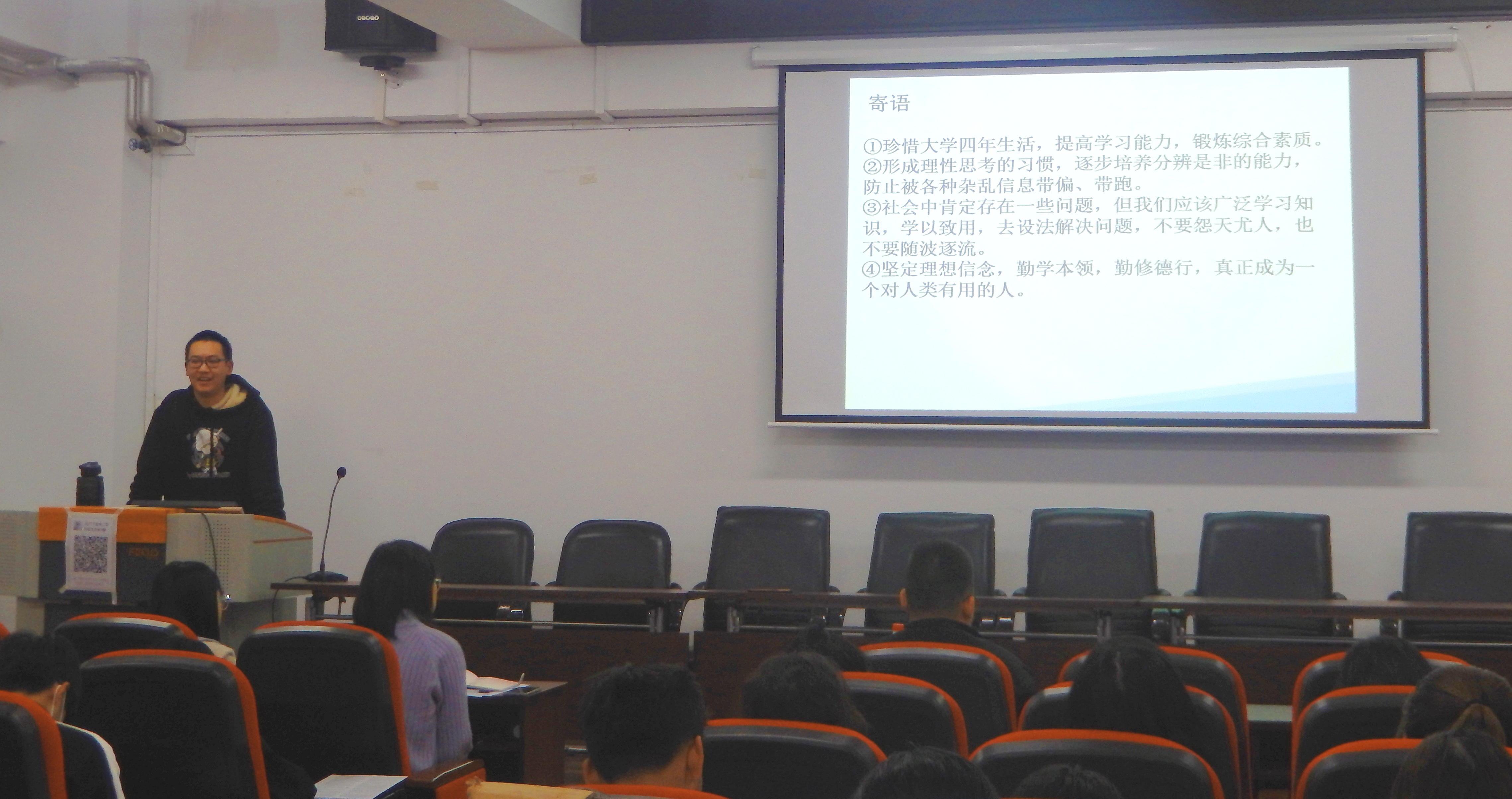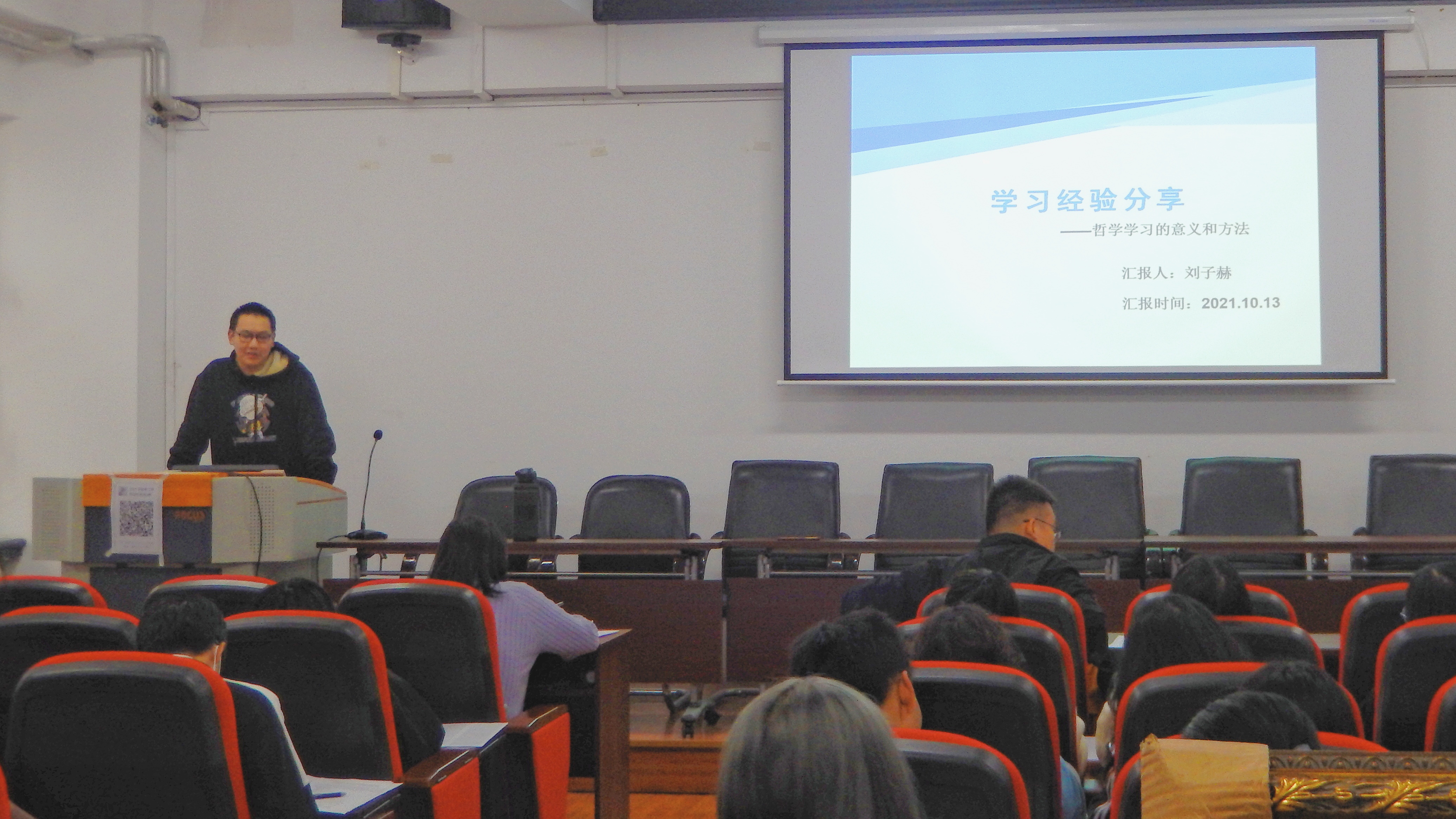 首先,焦瑞老师对学院优秀学生进行介绍,此次分享交流经验的是2019级的刘子赫同学。他目前任哲学学院学生团委副书记,班级团支部书记,并两次获得国家奖学金,目前成绩位列年级第一位,正努力准备保研。