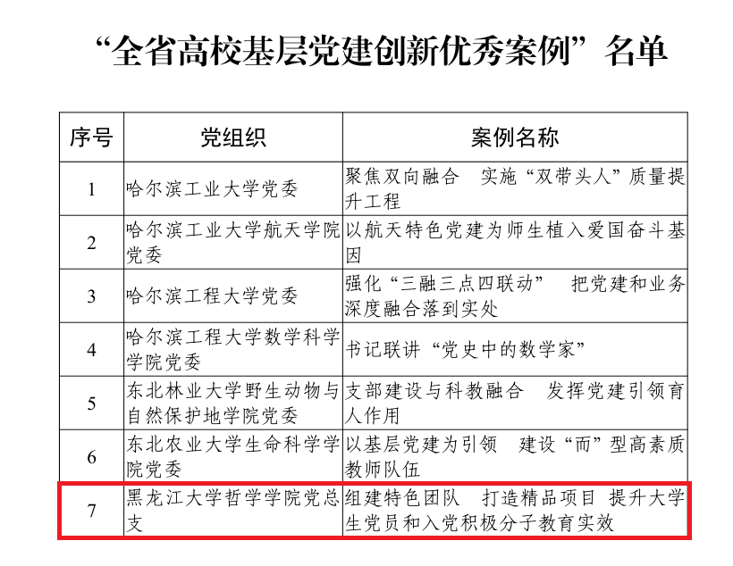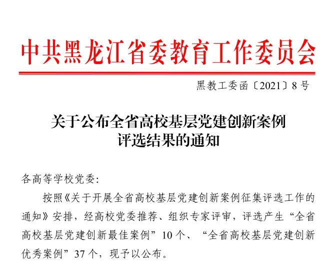 日前,省委教育工委下发了《关于公布全省高校基层党建创新案例评选结果的通知》(黑教工委函〔2021〕8 号)。按照《关于开展全省高校基层党建创新案例征集评选工作的通知》安排,经高校党委推荐、组织专家评审,评选产生“全省高校基层党建创新最佳案例”10 个、“全省高校基层党建创新优秀案例”37 个。由我院党总支报送的《组建特色团队打造精品项目提升大学生党员和入党积极分子教育实效》荣获“全省高校基层党建创新优秀案例”。